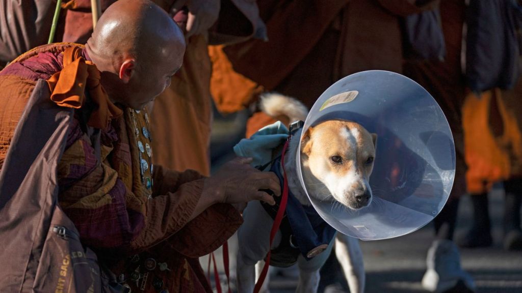 In the video, Aloka the Peace Dog wears a light jacket and walks on a leash near a quiet road. He still limps a little on his right back leg, but he keeps moving forward. The account also shared that Aloka is heading for a short reunion with monks in the Charlotte area. After that, he will return to the rehab center to continue healing.
