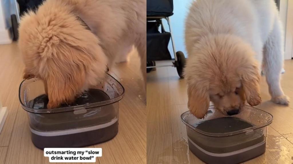 Dewey, a Golden Retriever puppy, has decided that a slow drink water bowl is not the boss of him, and this Instagram video from @misterdeweydadog captures just that. In the Reel, Dewey faces off with a water bowl designed to stop dogs from gulping down liquids too fast. The onscreen caption reads, “Outsmarting my ‘slow drink water bowl,’” and Dewey treats it like a puzzle he plans to win, because he is not to be trifled with.