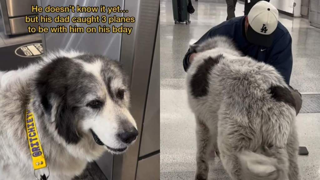 The clip begins with Ritchie calmly waiting inside the airport, unaware that a special surprise is moments away. Text displayed on the screen explains that his dad had taken three separate flights just to be there in time for the dog’s birthday.