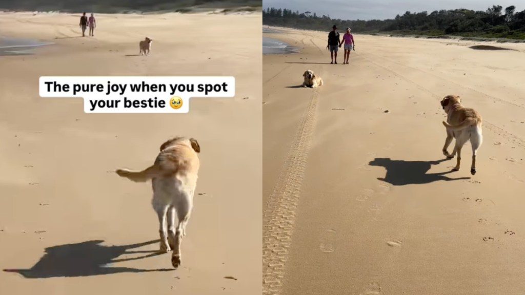 Mom asks if that’s her friend. Instantly, you see her pace pick up, but then she just hits the brakes. It seems like the Labrador needs a second to process the joy she is feeling on spotting her bestie on the beach. And then she’s finally ready to move again.