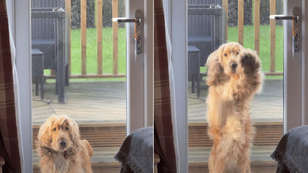 The video opens with Rhu standing completely still as he watches from the patio, but the second that his mom’s jacket comes out, his “chaotic energy” officially takes over. He starts pawing at the glass so fast it becomes a total blur, which is a classic move for a clingy breed like a Cocker Spaniel.