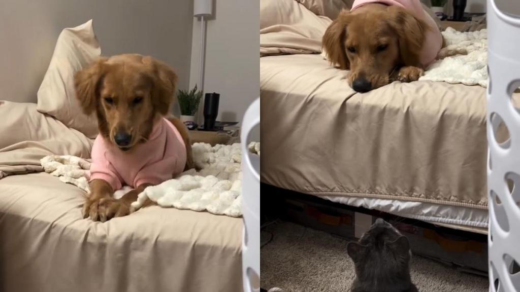 Golden Retriever and cat’s nightly routine is pure chaos