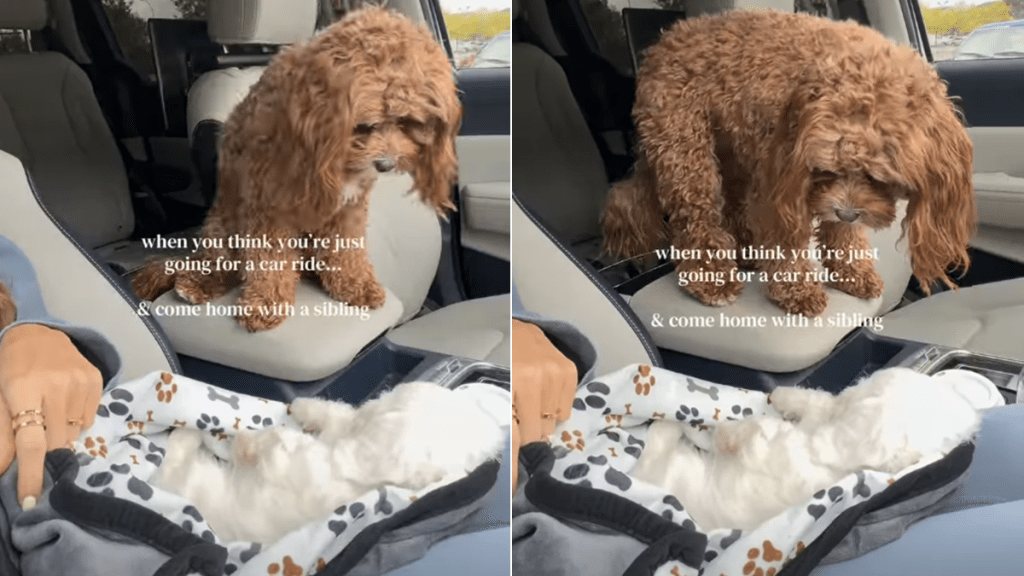 In the video, the dog sits on the passenger seat and stares down at a new tiny white furry puppy brother curled up in a carrier, as the on-screen caption says, “when you think you’re just going for a car ride…& come home with a sibling.”
